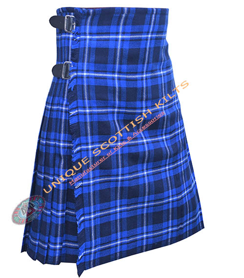 The design includes knife pleats that allow for ease of movement, making it ideal for dancing or active wear. The pleats are sewn down at the hips, creating a sleek silhouette. Genuine leather straps and rust-free buckles secure the kilt, ensuring it remains stylish and functional.