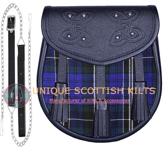 Introducing our Made to Order Scottish Clan Sporran, designed to showcase your clan pride at an affordable price. This black leather sporran features the Clan Tartan on the front, adorned with three matching leather tassels. Whether for formal or informal occasions, this semi dress sporran is a stylish choice. Crafted to the highest manufacturing standards, our range of sporrans, including budget, economy, and premium options, ensures both value and durability. Show your clan pride with this customizable and budget-friendly sporra