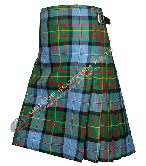 The design includes knife pleats that allow for ease of movement, making it ideal for dancing or active wear. The pleats are sewn down at the hips, creating a sleek silhouette. Genuine leather straps and rust-free buckles secure the kilt, ensuring it remains stylish and functional.