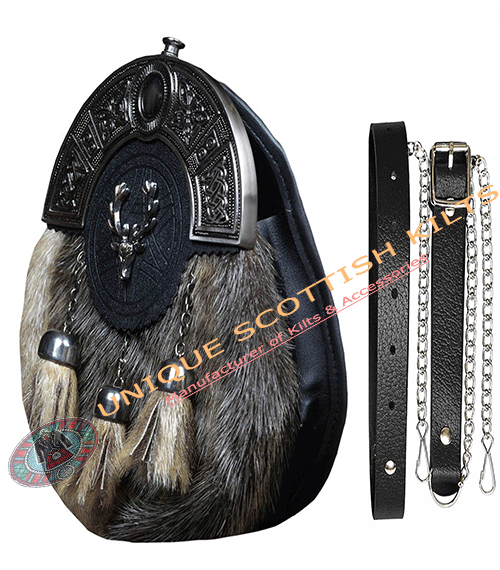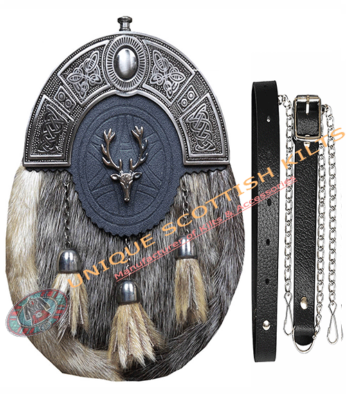 Full Dress Kilt Sporran Formal Seal Skin Celtic Cantle antique stag Head Badge