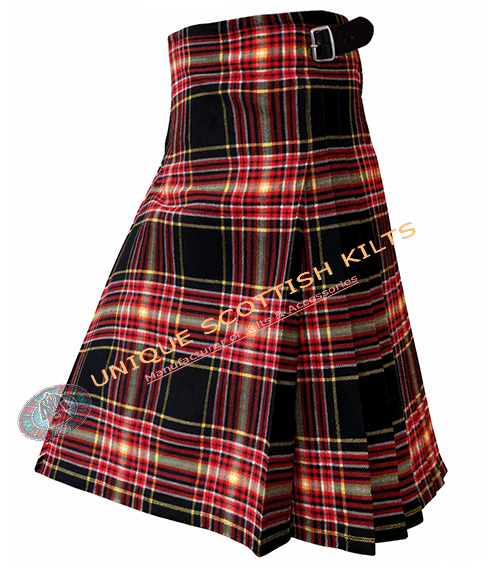 The design includes knife pleats that allow for ease of movement, making it ideal for dancing or active wear. The pleats are sewn down at the hips, creating a sleek silhouette. Genuine leather straps and rust-free buckles secure the kilt, ensuring it remains stylish and functional.