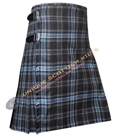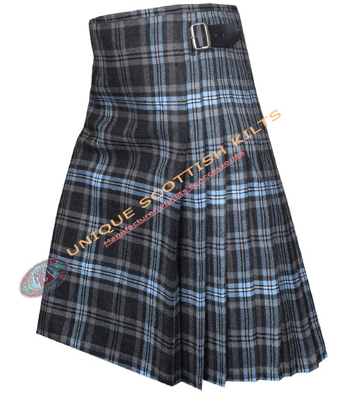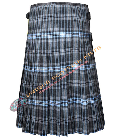 The design includes knife pleats that allow for ease of movement, making it ideal for dancing or active wear. The pleats are sewn down at the hips, creating a sleek silhouette. Genuine leather straps and rust-free buckles secure the kilt, ensuring it remains stylish and functional.