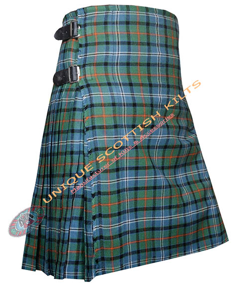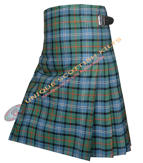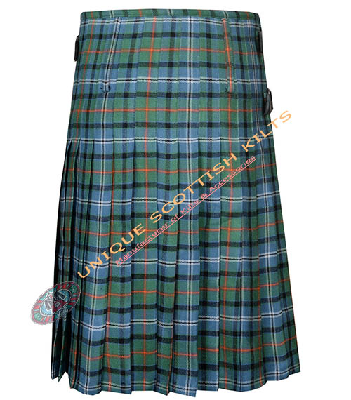 The design includes knife pleats that allow for ease of movement, making it ideal for dancing or active wear. The pleats are sewn down at the hips, creating a sleek silhouette. Genuine leather straps and rust-free buckles secure the kilt, ensuring it remains stylish and functional.