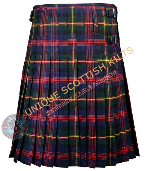 The design includes knife pleats that allow for ease of movement, making it ideal for dancing or active wear. The pleats are sewn down at the hips, creating a sleek silhouette. Genuine leather straps and rust-free buckles secure the kilt, ensuring it remains stylish and functional.