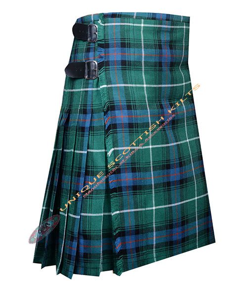 The design includes knife pleats that allow for ease of movement, making it ideal for dancing or active wear. The pleats are sewn down at the hips, creating a sleek silhouette. Genuine leather straps and rust-free buckles secure the kilt, ensuring it remains stylish and functional.