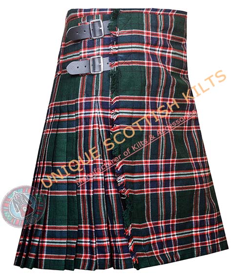 The design includes knife pleats that allow for ease of movement, making it ideal for dancing or active wear. The pleats are sewn down at the hips, creating a sleek silhouette. Genuine leather straps and rust-free buckles secure the kilt, ensuring it remains stylish and functional.
