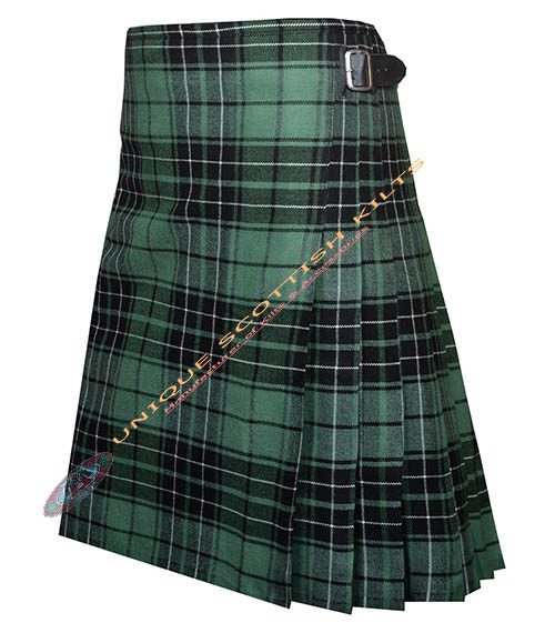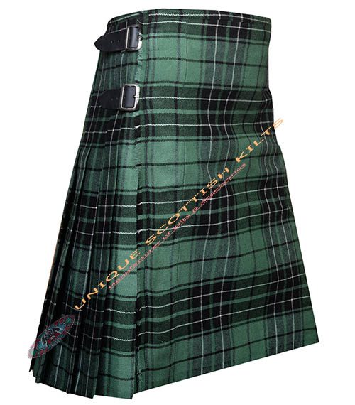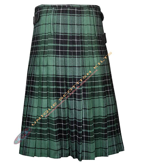 The design includes knife pleats that allow for ease of movement, making it ideal for dancing or active wear. The pleats are sewn down at the hips, creating a sleek silhouette. Genuine leather straps and rust-free buckles secure the kilt, ensuring it remains stylish and functional.