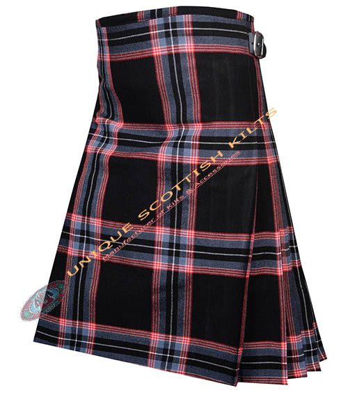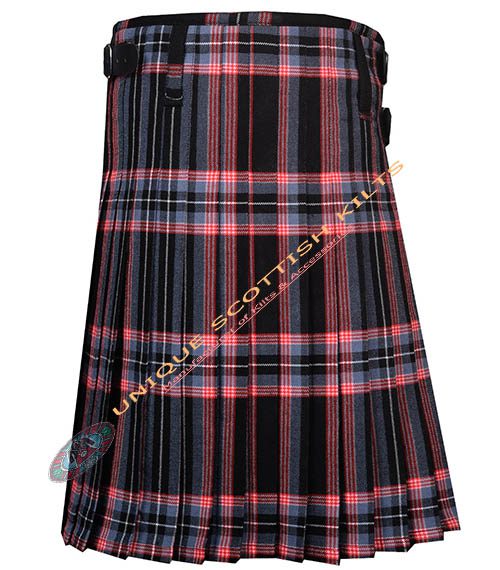 The design includes knife pleats that allow for ease of movement, making it ideal for dancing or active wear. The pleats are sewn down at the hips, creating a sleek silhouette. Genuine leather straps and rust-free buckles secure the kilt, ensuring it remains stylish and functional.
