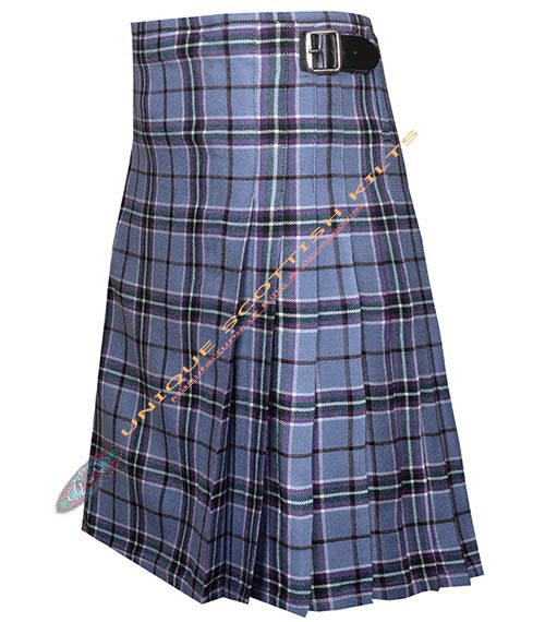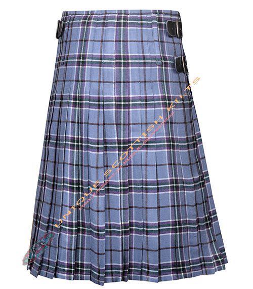 The design includes knife pleats that allow for ease of movement, making it ideal for dancing or active wear. The pleats are sewn down at the hips, creating a sleek silhouette. Genuine leather straps and rust-free buckles secure the kilt, ensuring it remains stylish and functional.